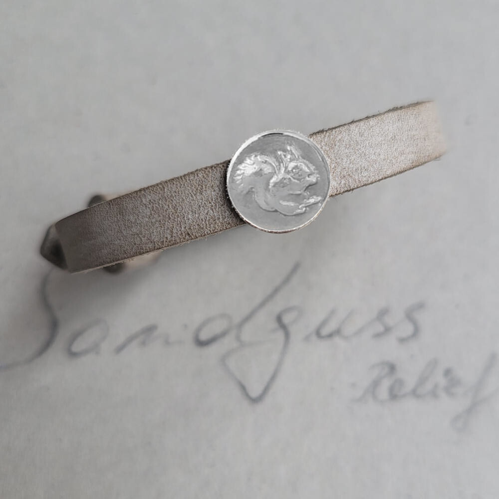 und zwei unterschiedlich farbigen Lederbändern.