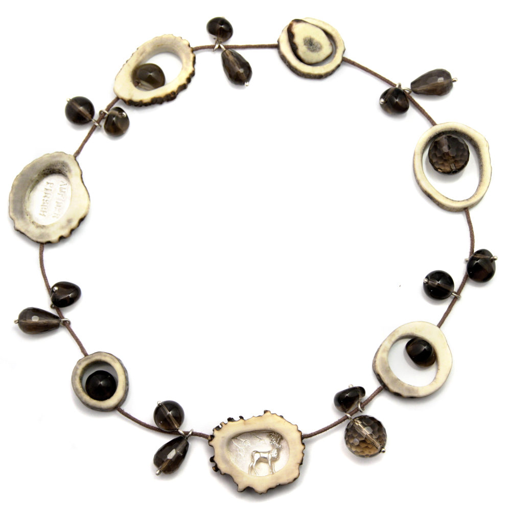 Unterschiedliche Rauchquarzkugeln verzieren die Zwischenräume. Zwei Hornelemente sind mit einer Silberscheibe unterlegt.