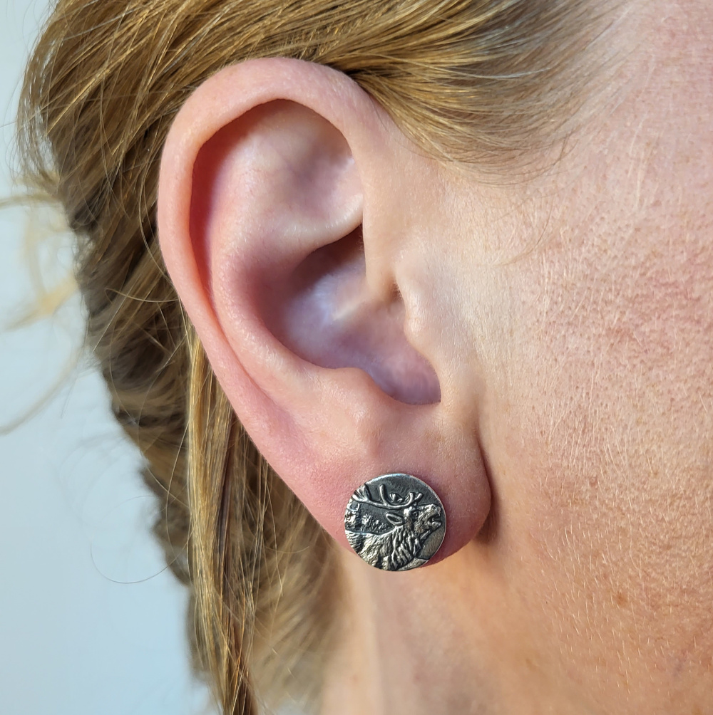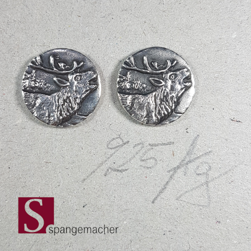Das Bild lieget erhaben auf einem runden Silberplättchen. An den erhabenen stellen des Ohrsteckers ist die Schwärzung durch polieren entfermt worden.