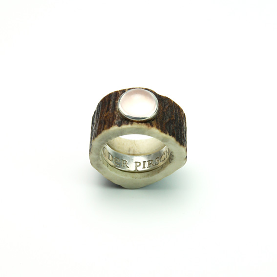 Hornring aus den abwurfstangen vom Rotwild, Rosenquarzcabbochon, 925 Ag