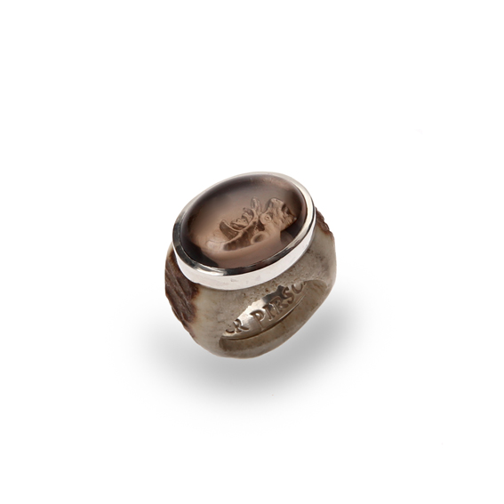 Auf dem bauchig gearbeiteten Siegelring thront eine Fassung mit einem Rauchquarzcabbochon unter dem ein röhrender Hirsch zu sehen ist.