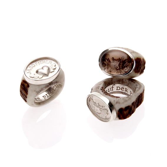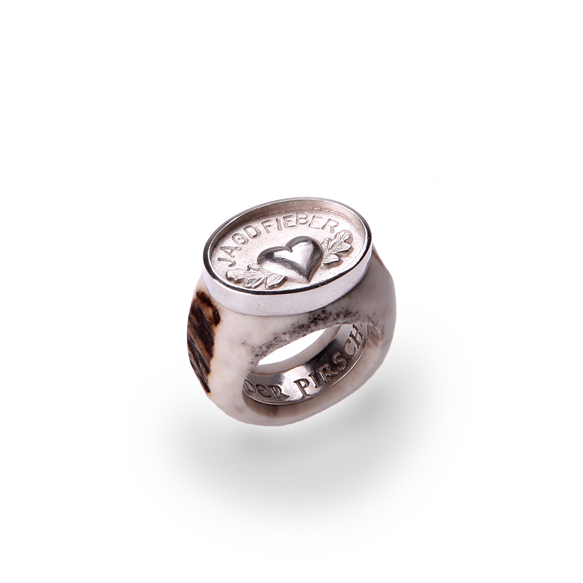 Auf dem bauchig gearbeiteten Siegelring thront eine Fassung, in der ein Herz mit Eichenlaubflügeln zu sehen ist.