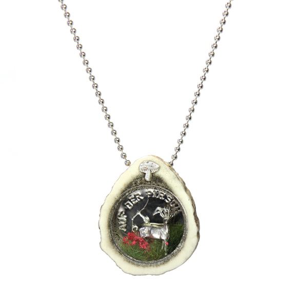 Anhäger mit einem kleinen Stilleben. Hinter der Glasscheibe sieht man einen Rehbock in einer Blumenwiese. Die Kugelkette ist fest integriert und wird mitgeliefert.