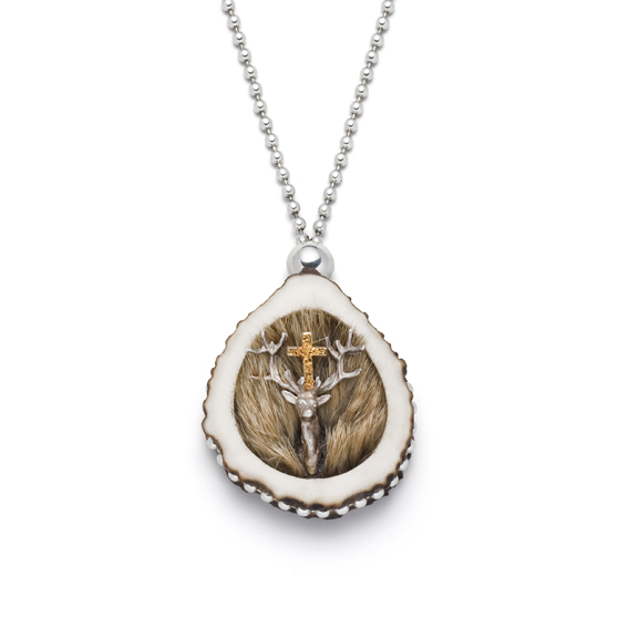 Dieser besondere Anhänger wird von der fest integrierten Kette umrandet. In dem vertiefeten Hornelement ist ein Fell eingelassen auf dem eine Hirschtrophäe thront.