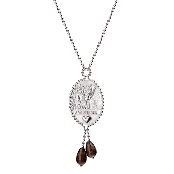 Der Stocknagel ist mit kugeldraht verziehrt. Unter dem Anhänger baumeln zwei Rauchquarztropfen, die an eine Kuckucksuhr erinnern.