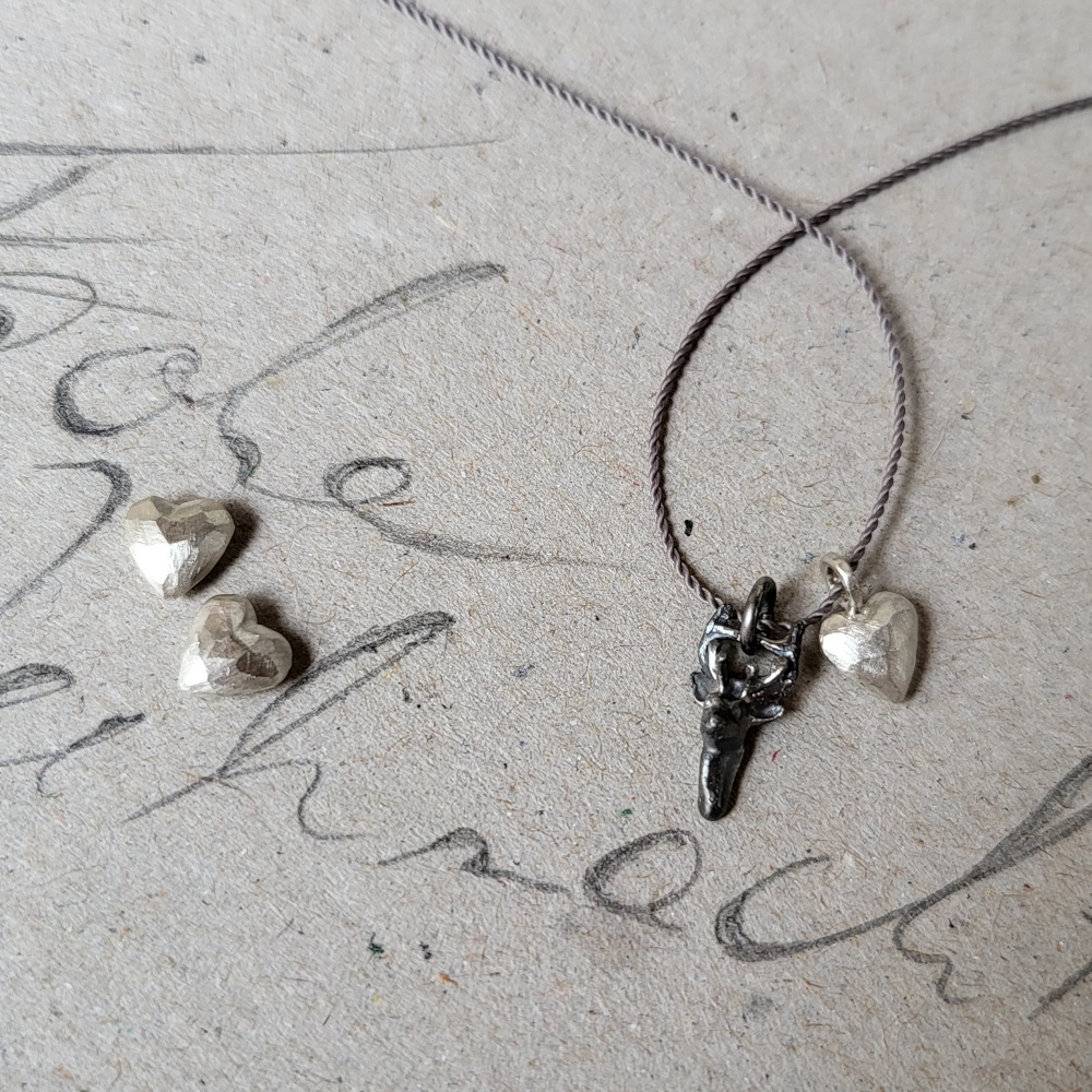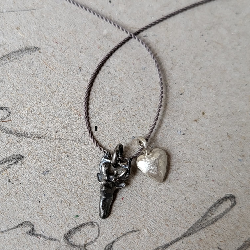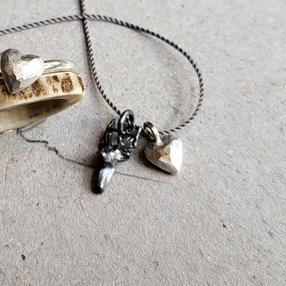 Das Hirschchen ist geschwärzt und das Herzchen hebt sich durch die helle Feinsilberoberfläche vom Hirschchen ab.