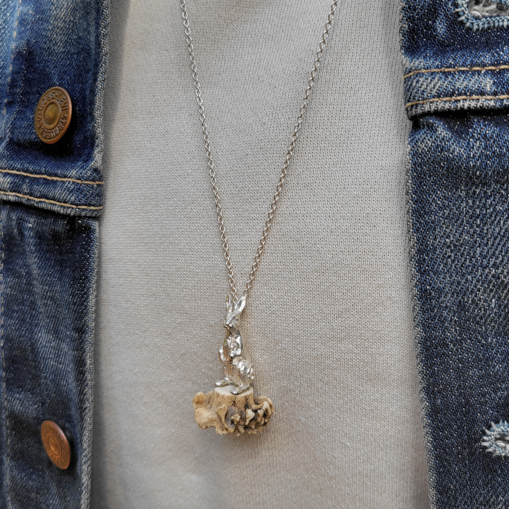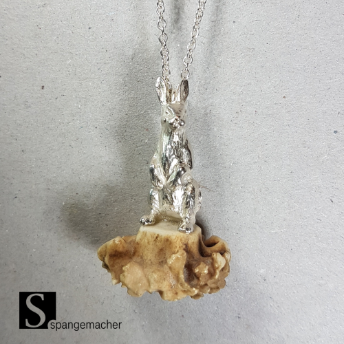 Ein kleiner Hase steht hier auf einer ebenso kleinen Rehrose. Die Rehrose wirkt fast wie ein Baumstumpf. Getragen wird dieser niedliche Anhänger an einer