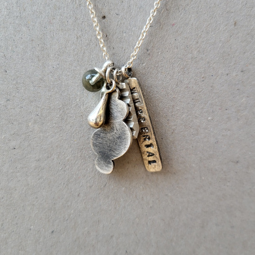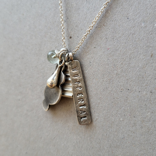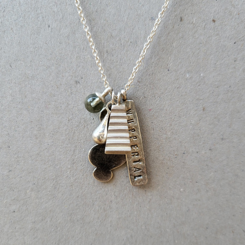 Die Kette Wuppertal ist 85cm lang und besteht aus einer Ankerkette mit Anhängern. Das Schildchen ist mit dem Schriftzug Wuppertal bestempelt. Eine Sammlung verschiedener Anhänger stellen die Verbindung zu Wuppertal dar. Unter andererm eine Wolke mirt Regentropfen und eine stilisierte Treppe. Zur Zierde und um etwas Farbe ins Spiel zu bringen wird die Kette durch eine Prasiolithkugel vervollständigt.