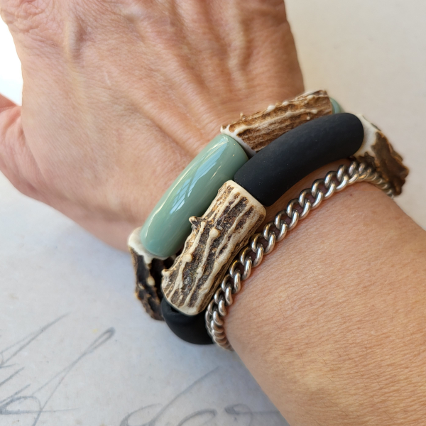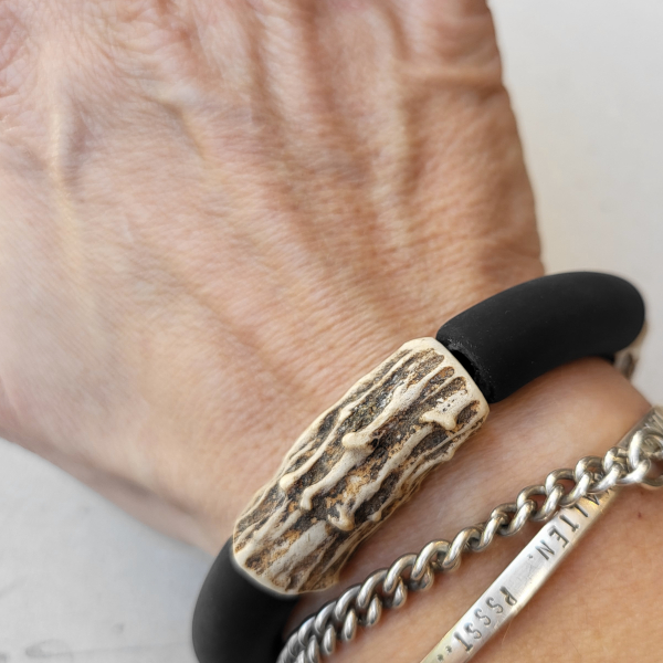 Das Hornarmband in schwarz macht einen eher klassischen Eindruck. Du kannst es auch mit Gold- oder Silberschmuck kombinieren.