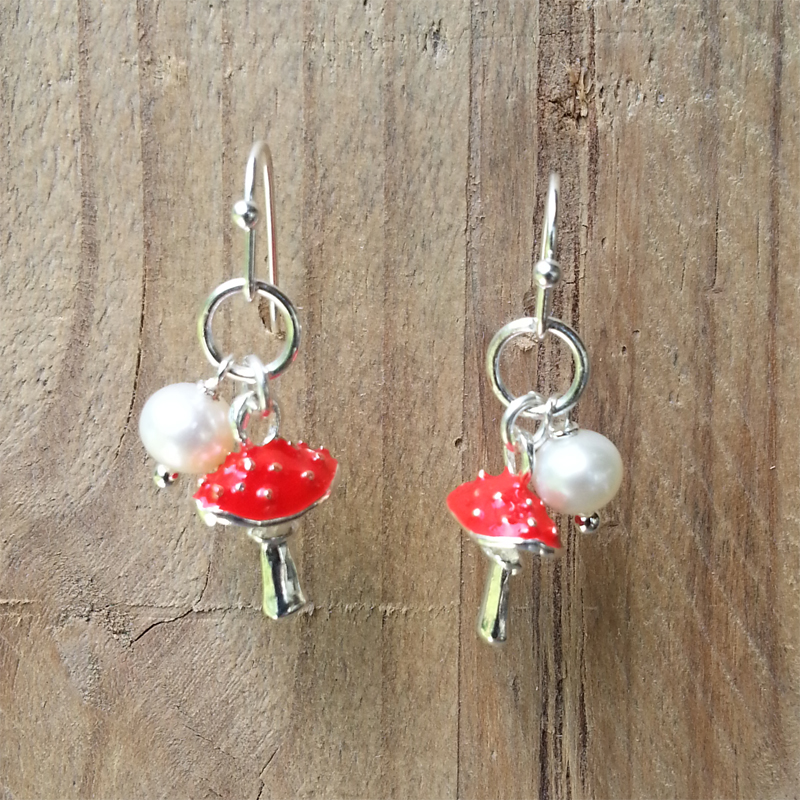 Ohrhänger versilbert mit emailliertem Fliegenpilz und Süßwasserperle.