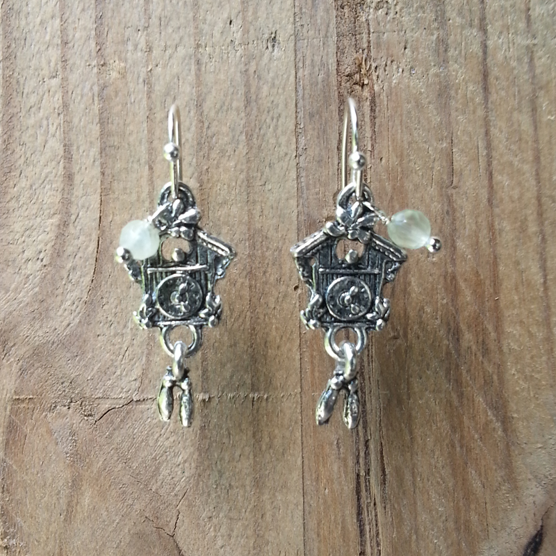 Ohrhänger mit Kuckucksuhr und Phrenitkugel. Die Zapfen der Kuckucksuhr sind beweglich.
