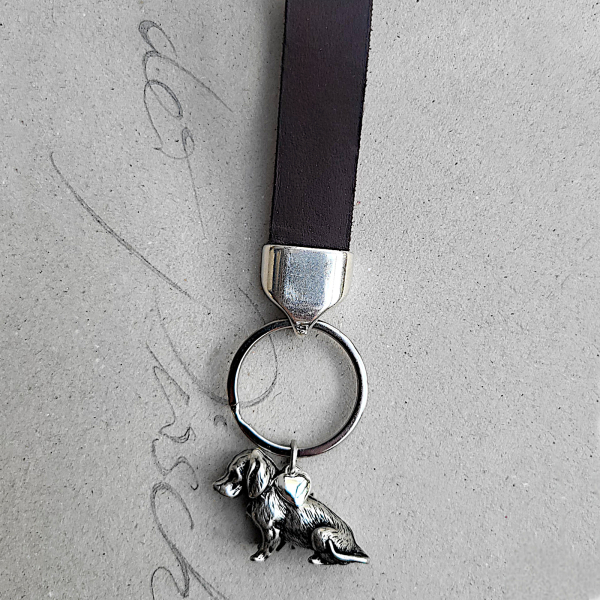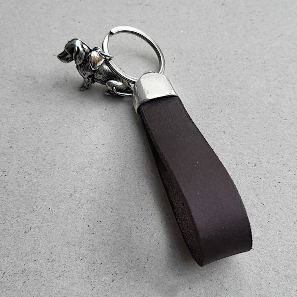 Dieser handgefertigte Schlüsselanhänger kombiniert eine robuste, angenehm zu tragende Lederschlaufe mit einem fein ausgearbeiteten Dackelanhänger aus Metall.