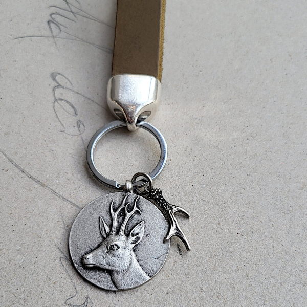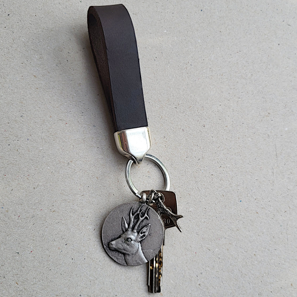 Dieser handgefertigte Schlüsselanhänger aus einem kräftigen, angenehm griffigen Lederriemen wird von einem fein gearbeiteten Rehbock-Anhänger begleitet – ein kleines Stück Natur, das man jeden Tag bei sich tragen kann.