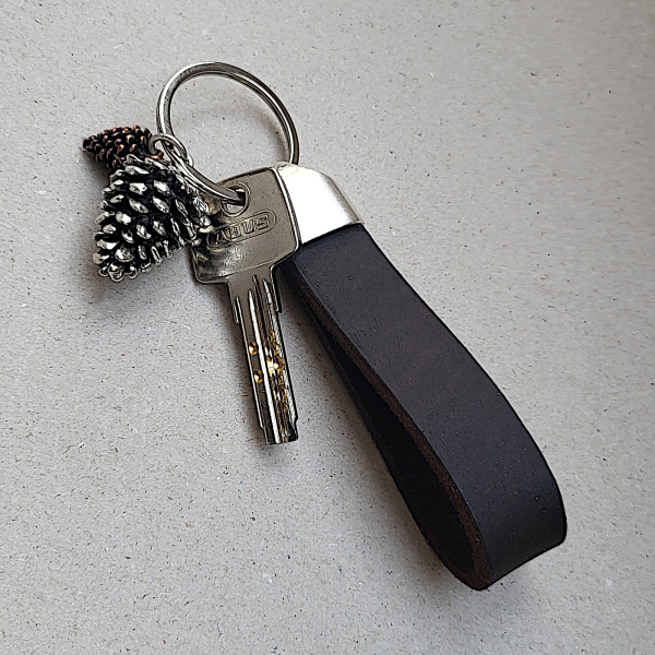 Die breite Lederschlaufe liegt angenehm in der Hand und sorgt für eine stabile Verbindung zum Schlüsselring, der zuverlässig hält. Durch meine sorgfältige Handarbeit wird jeder Schlüsselanhänger zu einem kleinen Unikat und zu einem idealen Begleiter für Waldliebhaber, Spaziergänger und Naturfreunde.