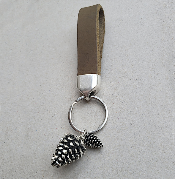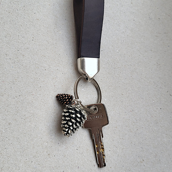 Dieser handgefertigte Schlüsselanhänger verbindet eine robuste Lederschlaufe mit zwei fein gearbeiteten Tannenzapfen aus Metall.