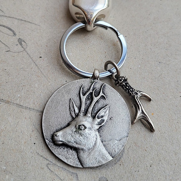 Der Rehbock-Anhänger besteht aus Zinkguss, ist versilbert und zeigt ein feines, gut erkennbares Wildmotiv.