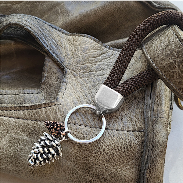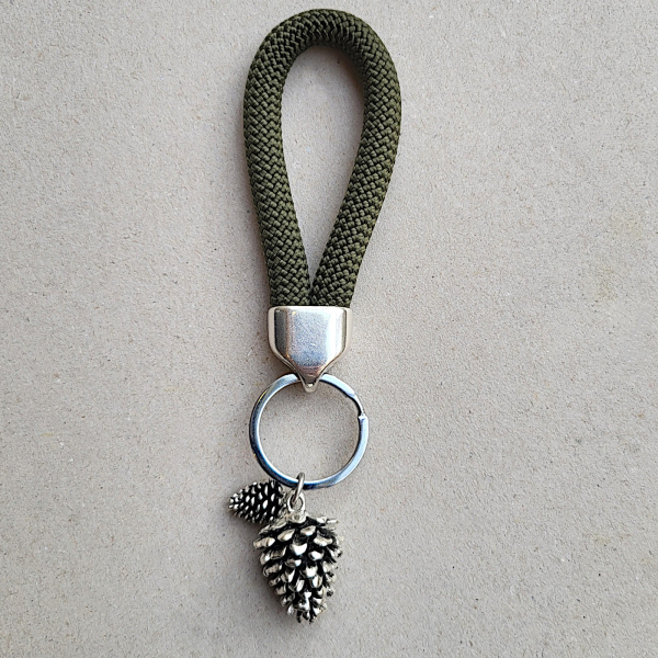 Dieser Schlüsselanhänger verbindet ein naturverbundenes Motiv mit der schlichten Robustheit einer Paracord-Schlaufe. Die beiden Tannenzapfen – ein größerer und ein kleinerer – bestehen aus Metall und erinnern an die wunderschönen Details eines Waldspaziergangs.