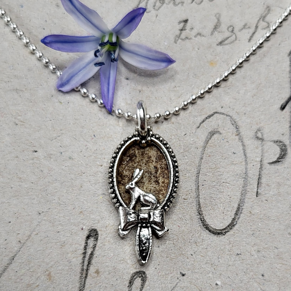 Der Rahmen wird von einer Schleife verziert und es sitzt ein Häschen darin. Hinterlegt ist dieser Rahmen mit einer Hornscheibe vom Dammwild.