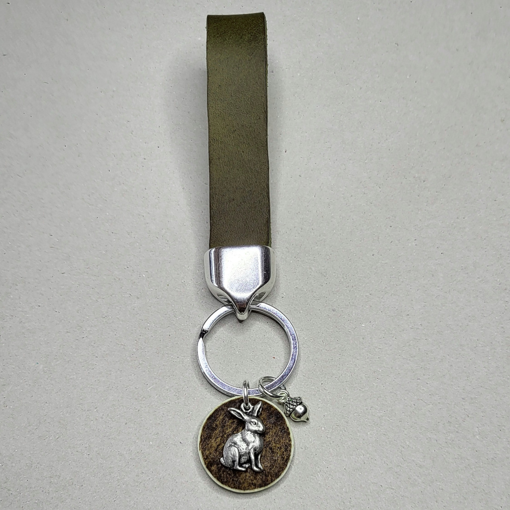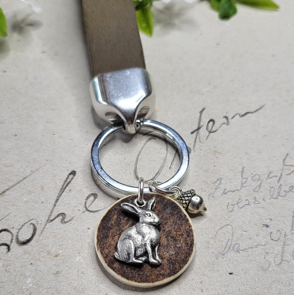 Der Schlüsselanhänger mit einem süßen Hasen auf einer Hornscheibe und einer kleinen Eichell erinnert bestimmt an schöne