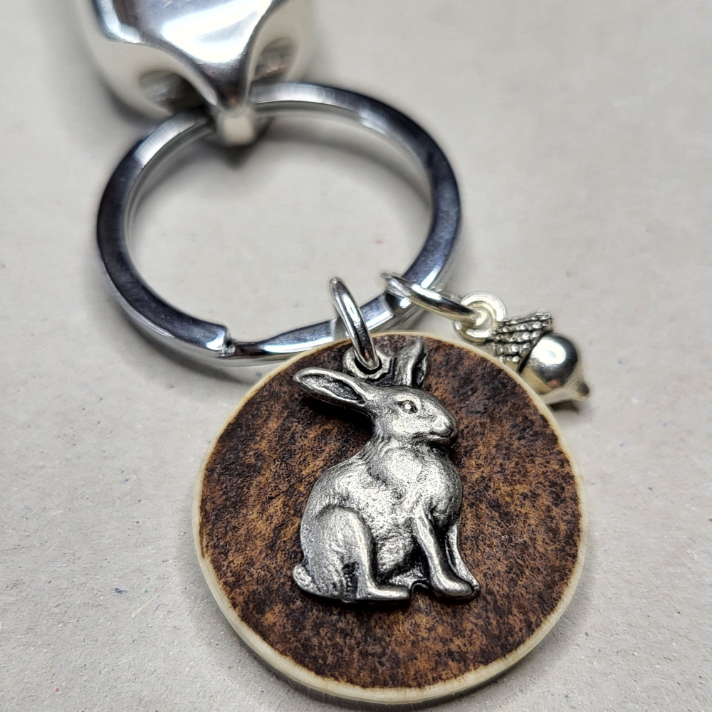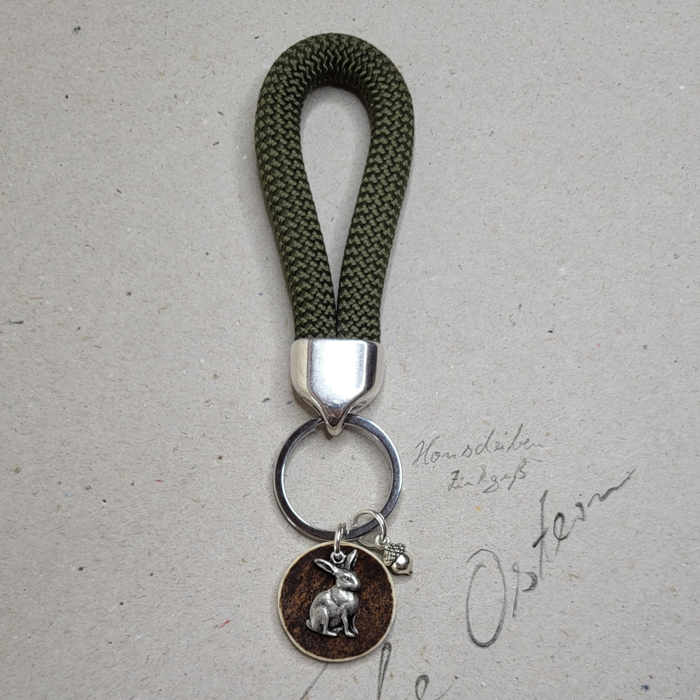 Der Schlüsselanhänger mit einem süßen Hasen auf einer Hornscheibe und einer kleinen Eichel erinnert bestimmt an schöne
